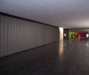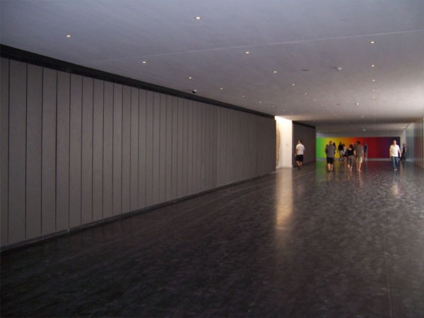 On its west side of the air-conditioned passageway tunnel, had been installed unique special glazed semi white Longoton® 350mm width x3000mm height Terracotta tiles made by Moeding in the back of water cascades protected by prismatic glass. On the east side of the passageway tunnel had been installed exclusive black glazed surface Longoton® 350mm width x3000mm height Terracotta tiles made by Moeding, which feels organic material and create unique piece of art in the passageway tunnel used for exhibition.